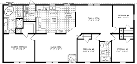 Ideal for hosting family gatherings and entertaining, the IMP-46013B double wide modular home offers owners 1,600 square feet of thoughtfully designed space. The home includes four total bedrooms and two full baths, as well as a family room, living room, and kitchen with a cozy morning room. The master bedroom features an ensuite bath with optional oval tub, as well as a spacious walk-in closet.